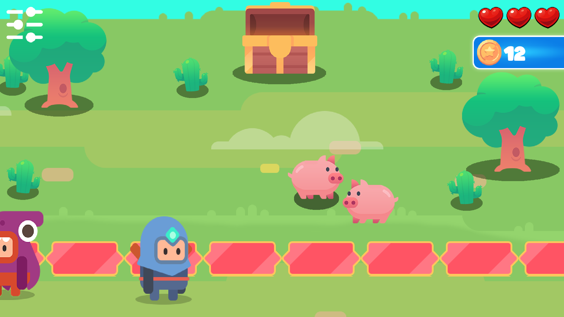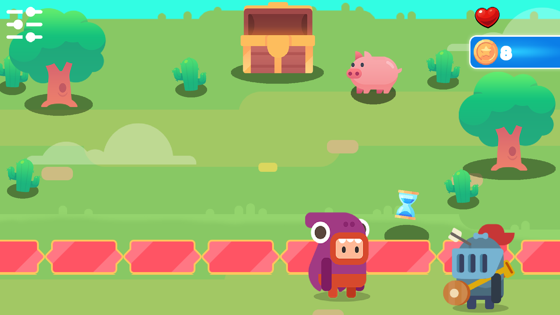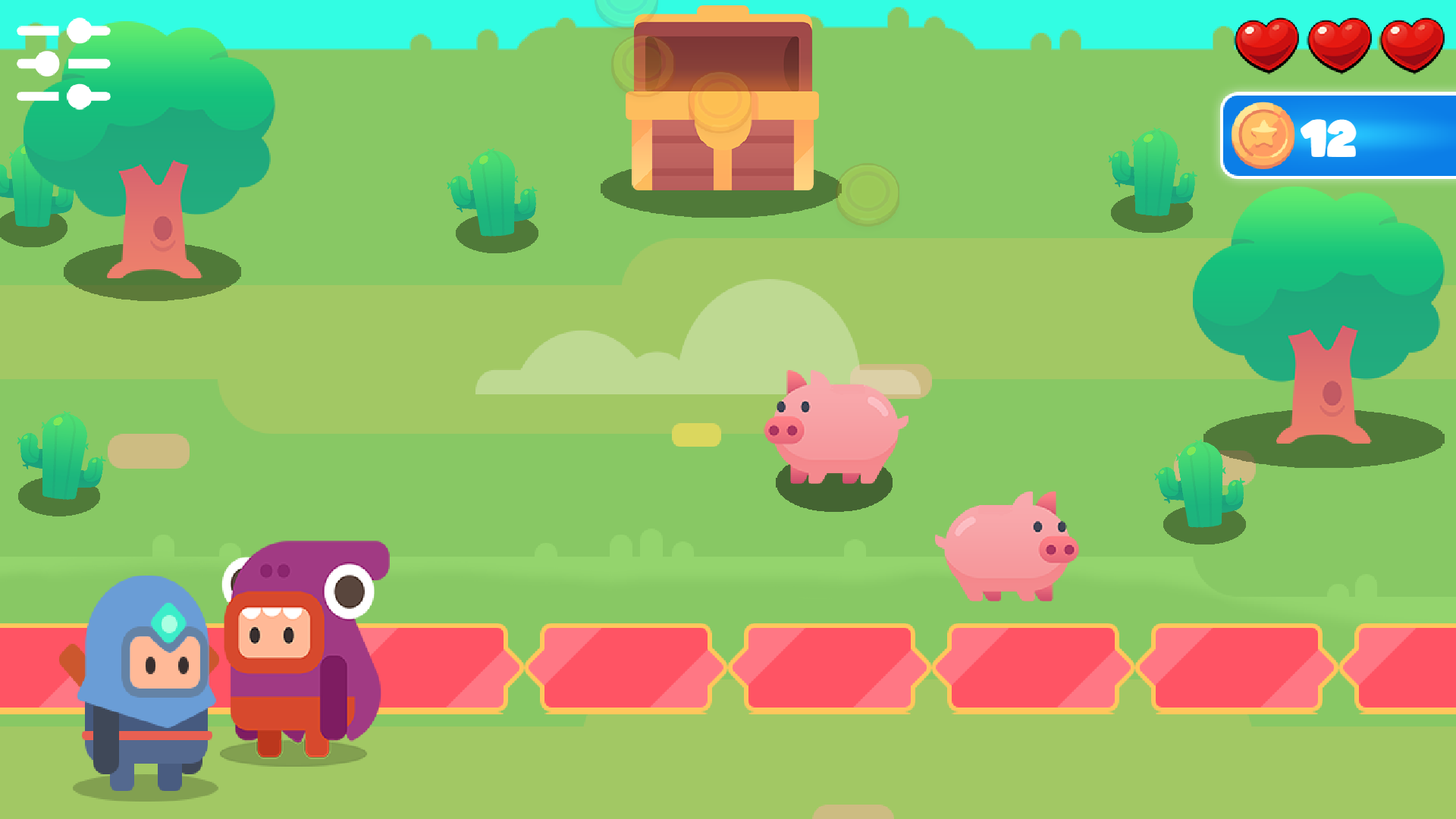 You are the guardian of the royal chest. Loyal subjects bring gifts to the king, and your task is to carry each one safely to the chest. But be careful: if a gift is left unattended, the sneaky pig will snatch and eat it! You have limited lives, so be fast and precise.